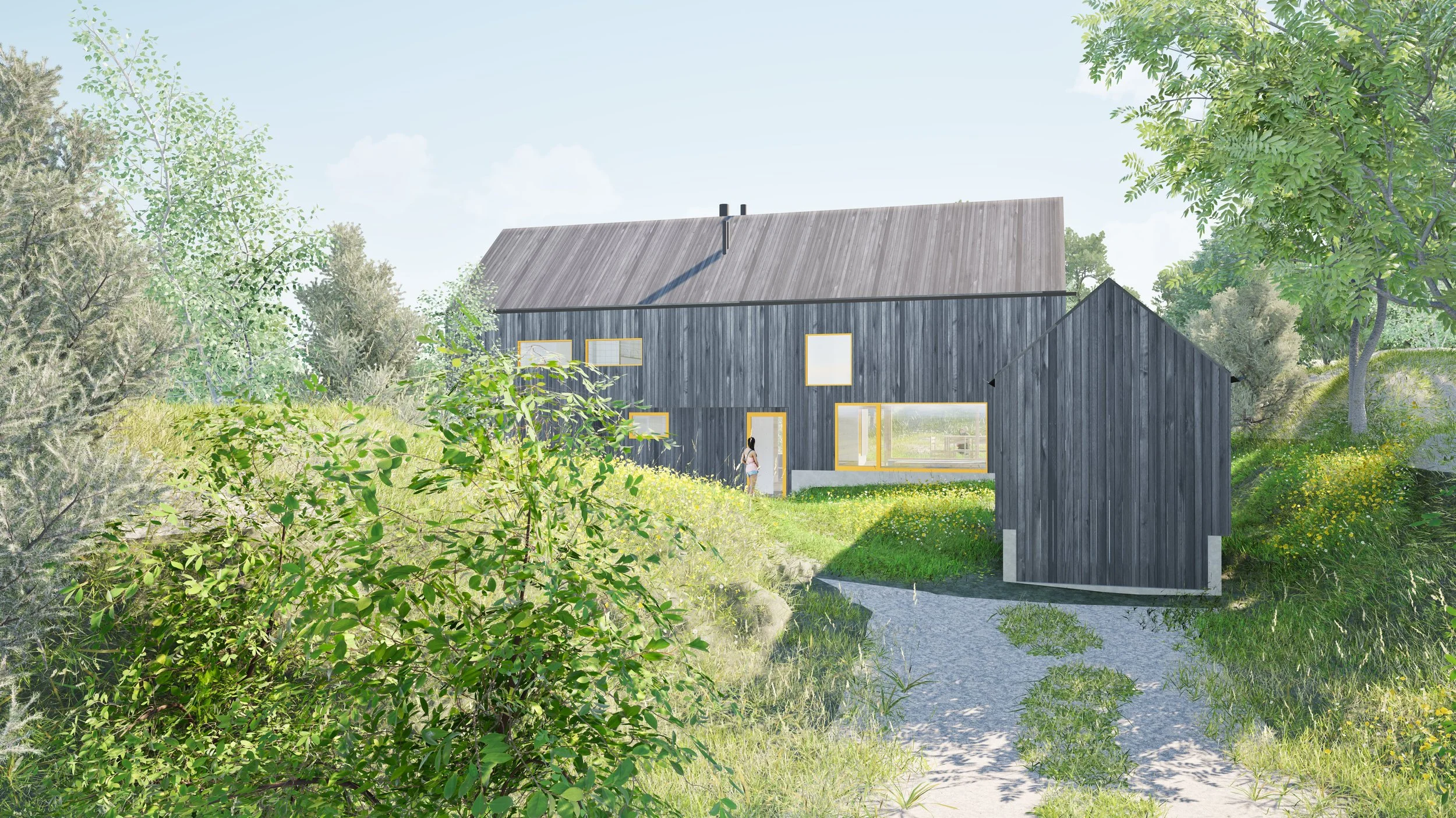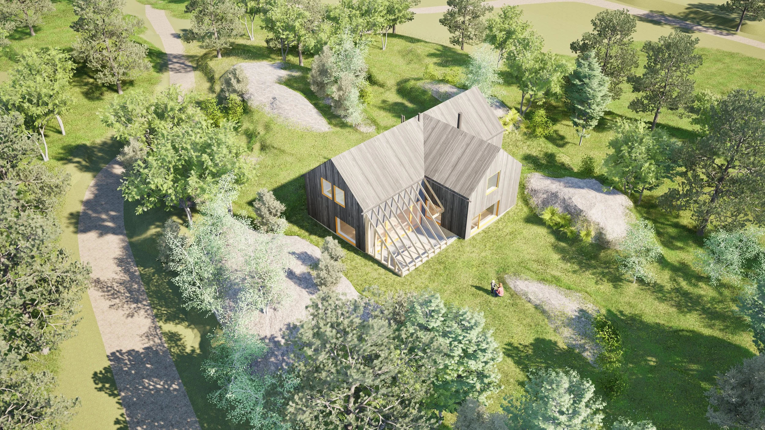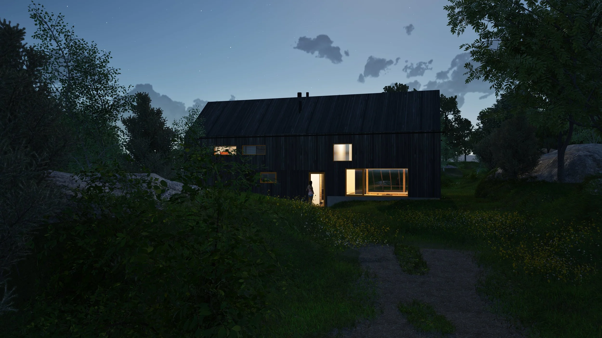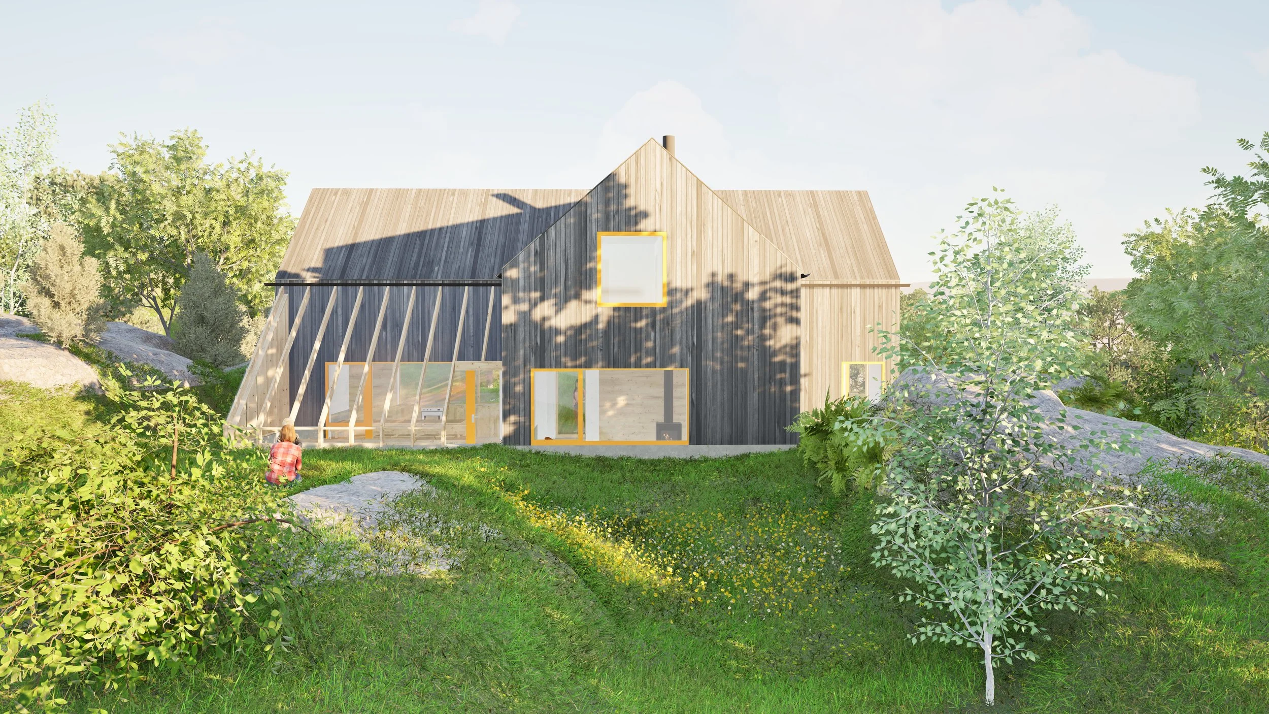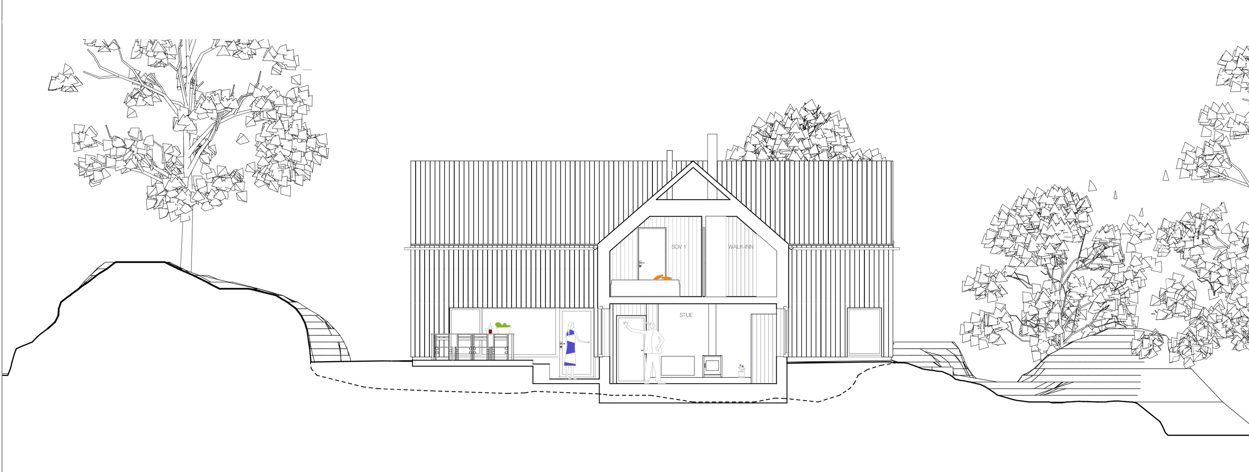 Ny fritidsbolig på Tjøme under planlegging. Fritidsboligen ligger på en vakker, skjermet tomt mellom bratte svaberg. Av hensyn til den sårbare kystlinjen i Færder komme er bygningen lagt ned i terrenget for å å unngå å ruve i landskapet. Prosjektet er skånsomt planlagt uten sprengninger, store fyllinger eller skade på naturen rundt.